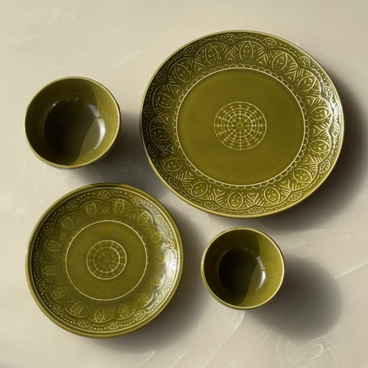 Green Embossed Ceramic Dining Set with Plates & Bowls