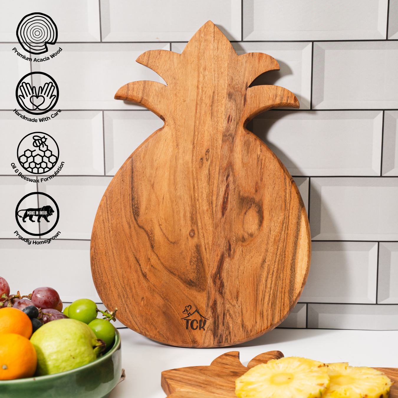 • Unique wood patterns – Each pineapple board is one-of-a-kind, thanks to acacia’s natural grain.