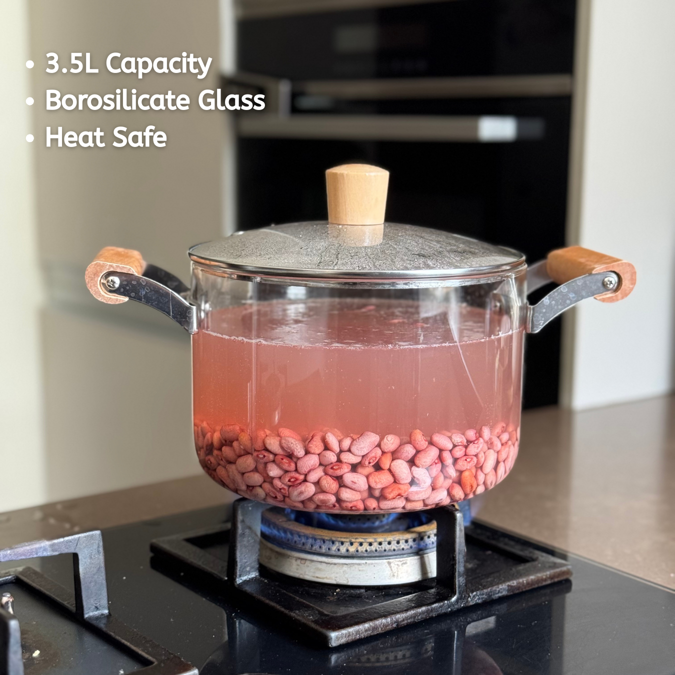 Glass Pot with Wooden Handles | Heat Safe Borosilicate Glass Pot | 3.5L