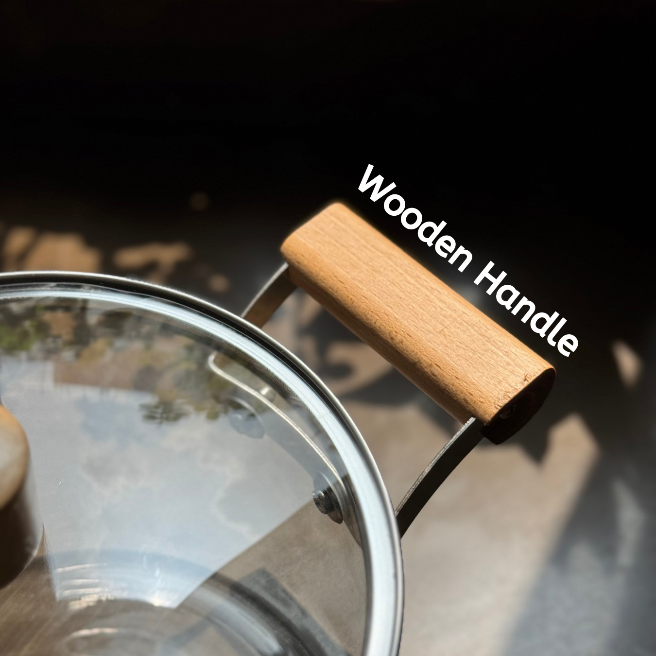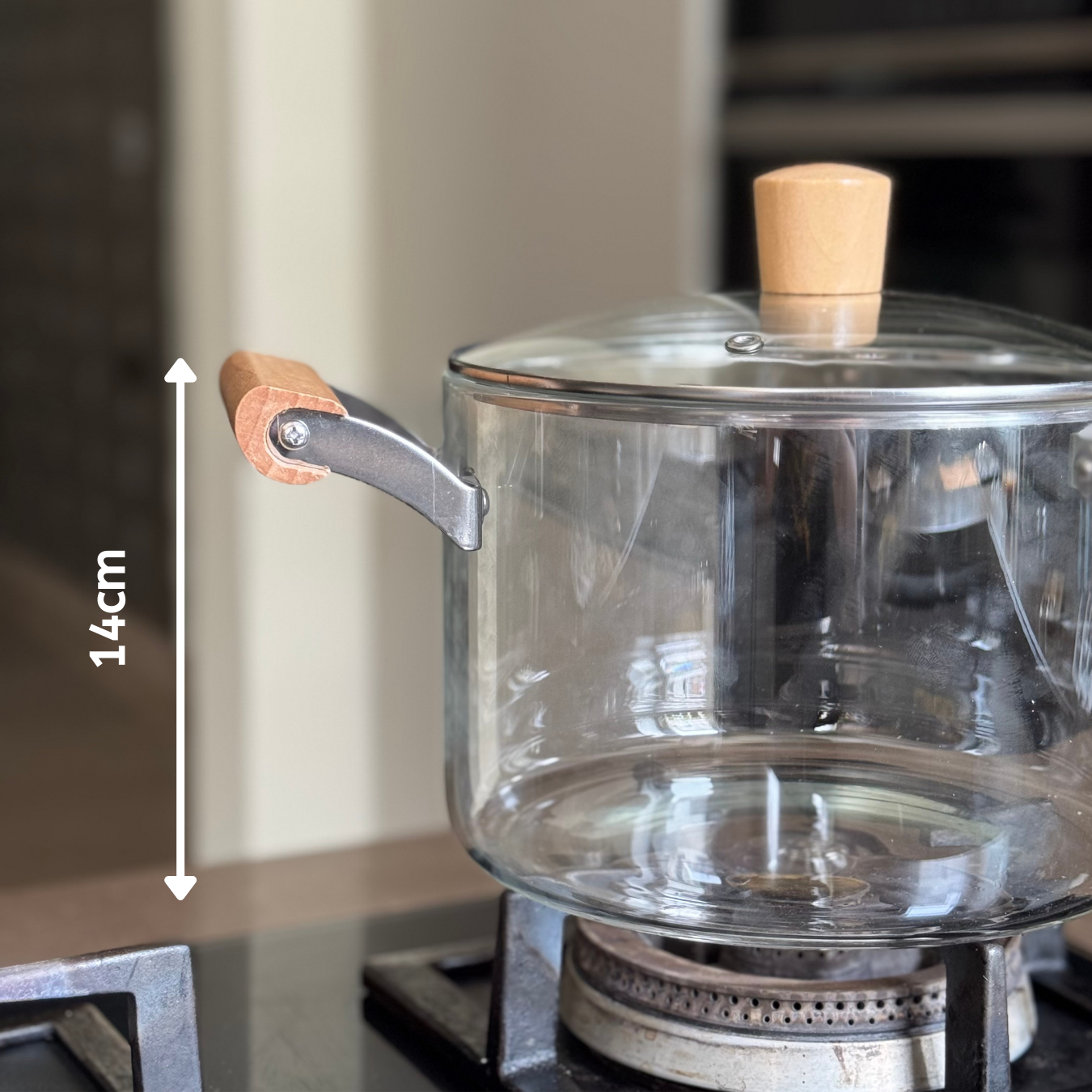 Bring beauty and precision to your kitchen with this premium borosilicate glass pot, thoughtfully designed for both elegance and everyday functionality. Its crystal-clear body allows you to observe every stage of the cooking process, while the sturdy wooden-accented handles and stainless-steel rimmed lid blend natural charm with modern durability. Perfect for simmering sauces, crafting hearty soups, or preparing delicate broths, this pot is as versatile as it is timeless.