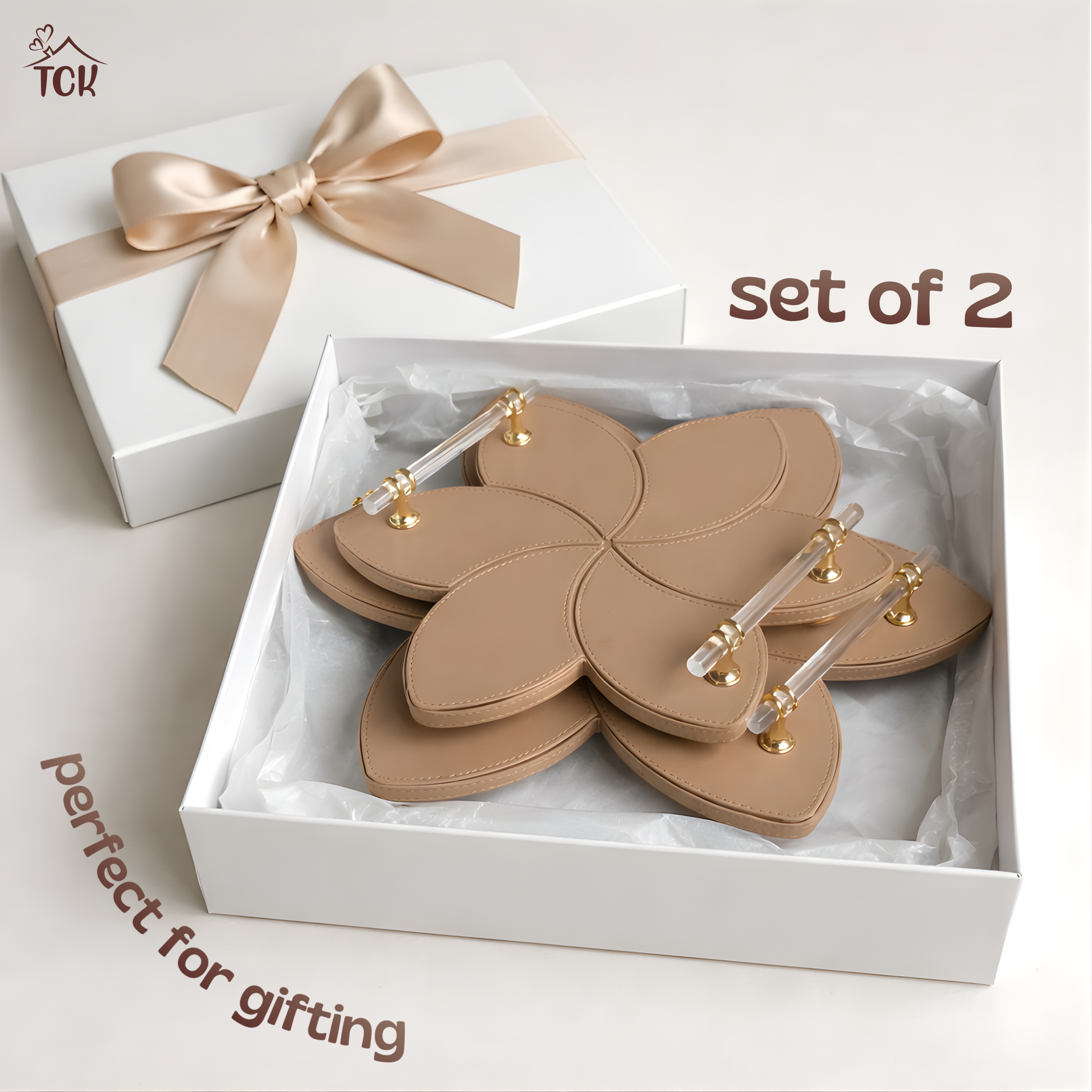 Elevate your hosting experience with our Luxe Serving & Decor Trays, crafted in a unique floral silhouette with a sleek faux leather finish. Designed to blend functionality with sophistication, these trays are perfect for serving drinks, showcasing décor, or simply adding a touch of luxury to your living space. The trays feature sturdy gold-toned metal hooks paired with transparent PVC glass bar handles, ensuring both style and durability. Available in a set of two sizes, they seamlessly cater to different serving needs while doubling as elegant statement pieces.