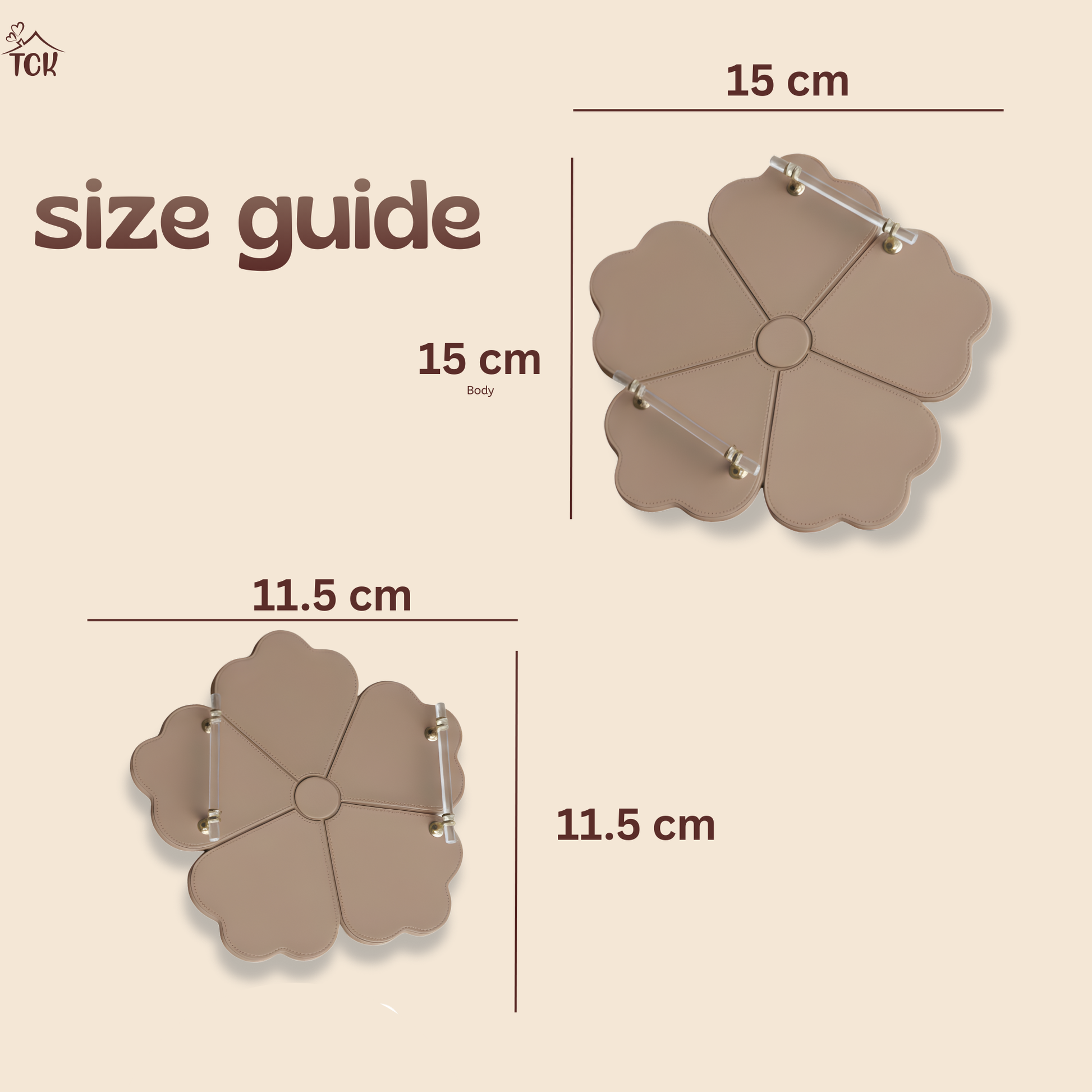 • Dark Beige with golden hooks and transparent handles