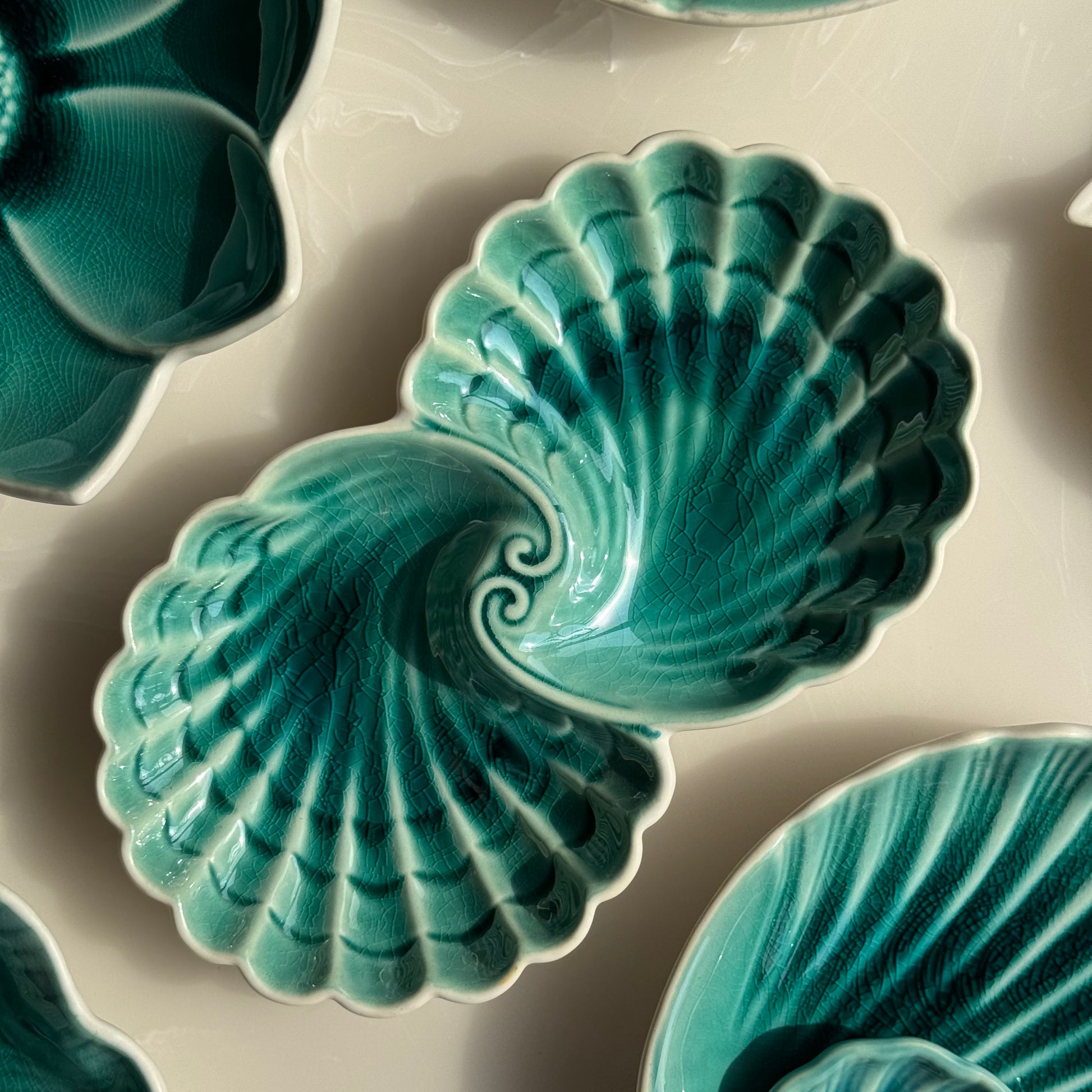 Elevate your serving style with this peacock-inspired snack plate, crafted in a graceful twin-shell form that echoes the elegance of a peacock’s feathers. Finished in a rich, jewel-toned crackle glaze, the flowing ridges and sculptural curves create a striking play of texture and depth. Perfect for snacks, appetisers, or festive spreads, this plate brings artistry and sophistication to every table setting.